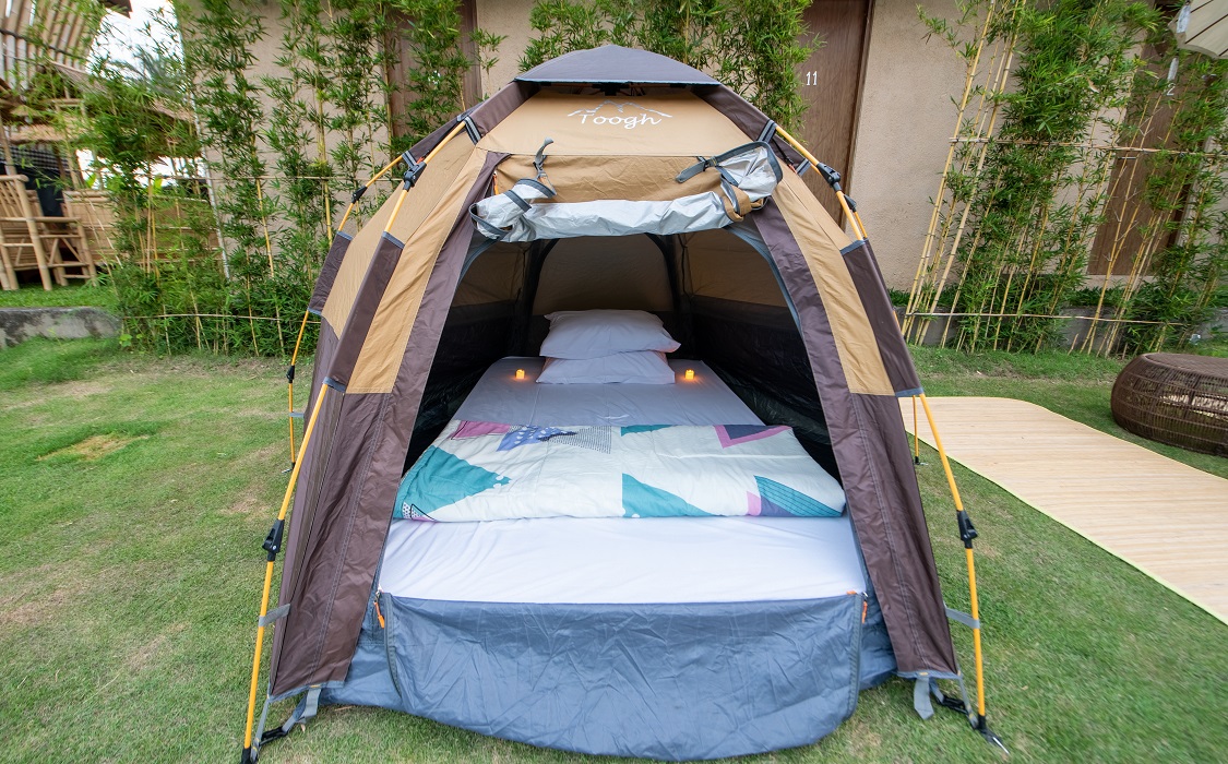 Make your new experience and sensation stay in camping tent with a soft bed inside.